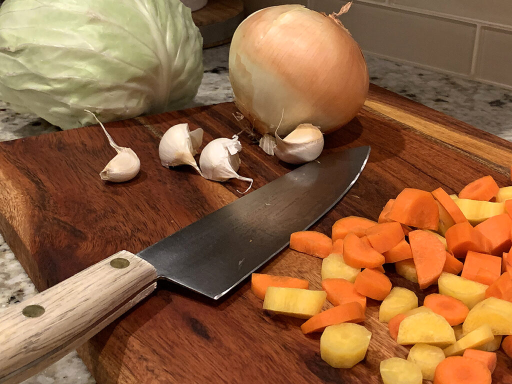 Heat Dutch oven on medium-high. Add ground meat and cook for about 2 minutes. While meat is browning cut up your carrots and onions.