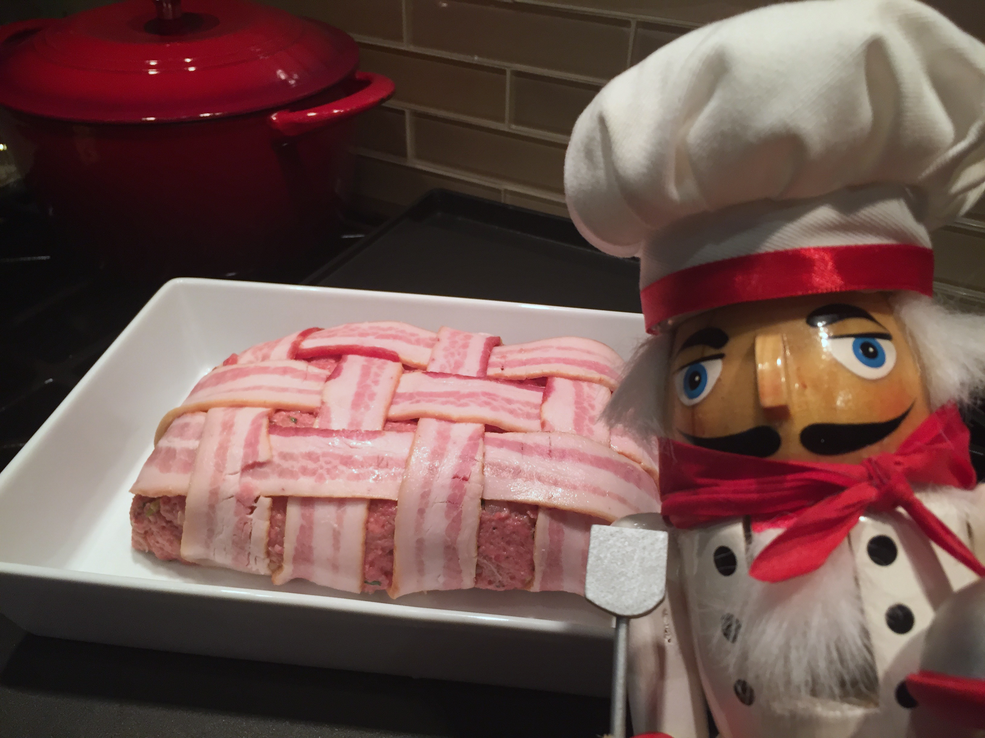 I made this bacon wrapped meatloaf for Anthony who has so generously offered to help me with understanding this whole WordPress/Blog thing. He’s quite the IT knowledge base and has already built many websites in his day. I have a new found respect for all bloggers out there, and especially anyone who has built there blog from the ground up. It is not as easy as it may seem. However, this meatloaf is a snap, and with the bacon lattice topping, it’s also really pretty. And who, except vegetarians, doesn’t like bacon? Pepé was so excited, I had to talk him out of wrapping himself in bacon.