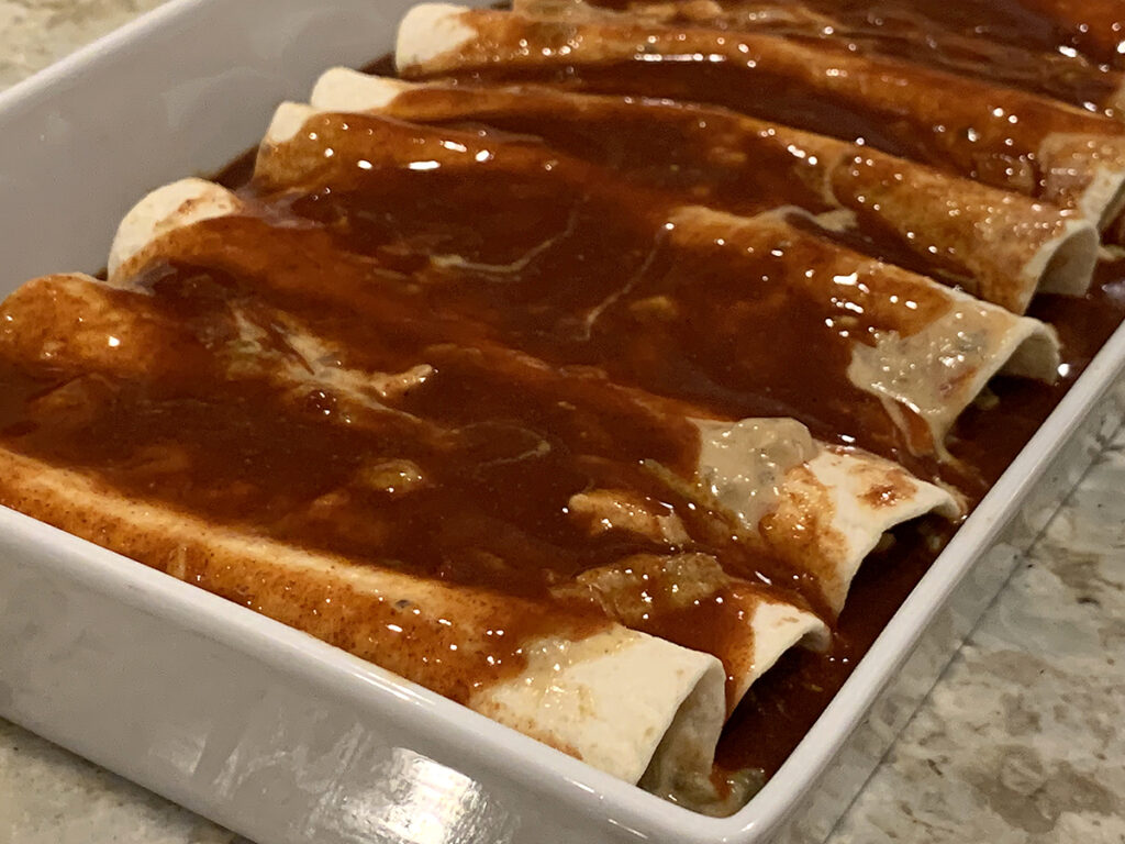 The red sauce surrounds these delicious enchiladas like a blanket of love with a layer on the bottom and another on the top. It has a more earthy chili flavor than the white sauce. The contrast in flavors is amazing and a family favorite in my house.