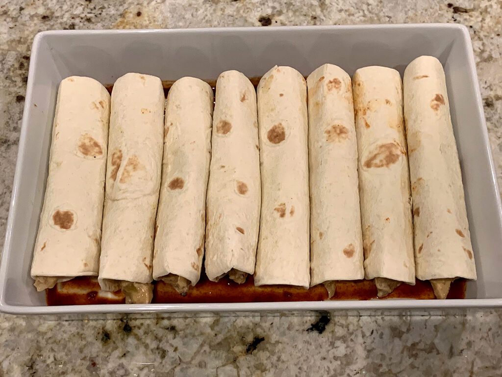 Divide filling among the 8 tortillas. Spread some of the red enchilada sauce on the bottom of a 12” x 8” x 2” (or similar size) oven safe dish. This will help prevent the enchiladas from sticking to the bottom of the dish.