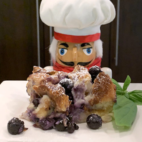 - Evenly distribute blueberries over the top and poke some in and under the croissants. or layer half the croissant pieces, half the blueberries and repeat. Blend cream cheese, sugar, eggs, milk and vanilla in a blender or mixer. Pour batter evenly over berries and croissant pieces.