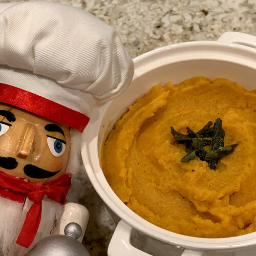 - Preheat oven to 400°F/205°C/Gas Mark 6). Cut ends off of squash (this is optional, it just makes it more stable when you stand the squash up). Cut it vertically in half and scoop out seed with a spoon. Drizzle each with olive oil and season cut side with salt and pepper. Place cut side down on a parchment lined sheet pan and roast for 40 minutes or until fork tender. Scoop out the flesh with a spoon, (leaving the outer skin behind) and place squash in a bowl along with salt, pepper and 2 tablespoons of sage brown butter *see notes below. Mix with hand or stand mixer until smooth. Serve immediately or cover and keep warm.