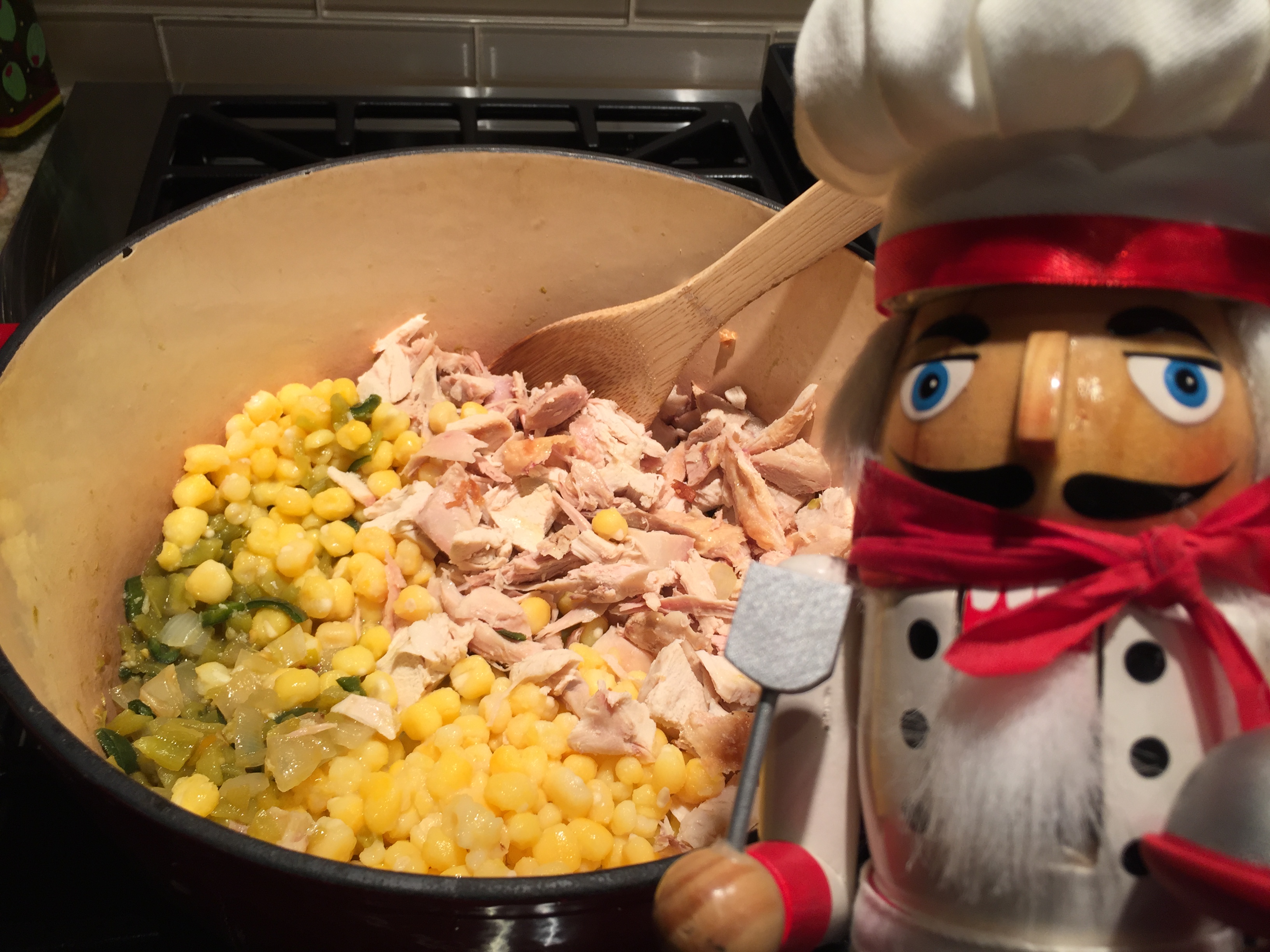 Add garlic and cook for one minute. Then add chicken stock, hominy, green chilies, cumin, Mexican oregano, ancho chili powder and salt and pepper to taste. Cook for about 45 minutes.