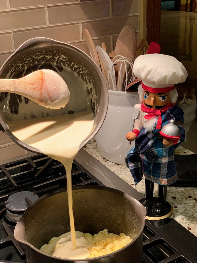 In another smaller sauce pan, add milk, cream, butter, dry mustard, cayenne pepper and white pepper. Heat (not boil) until butter is melted and seasonings are incorporated. Add the cheese and stir until it’s all smooth and creamy.