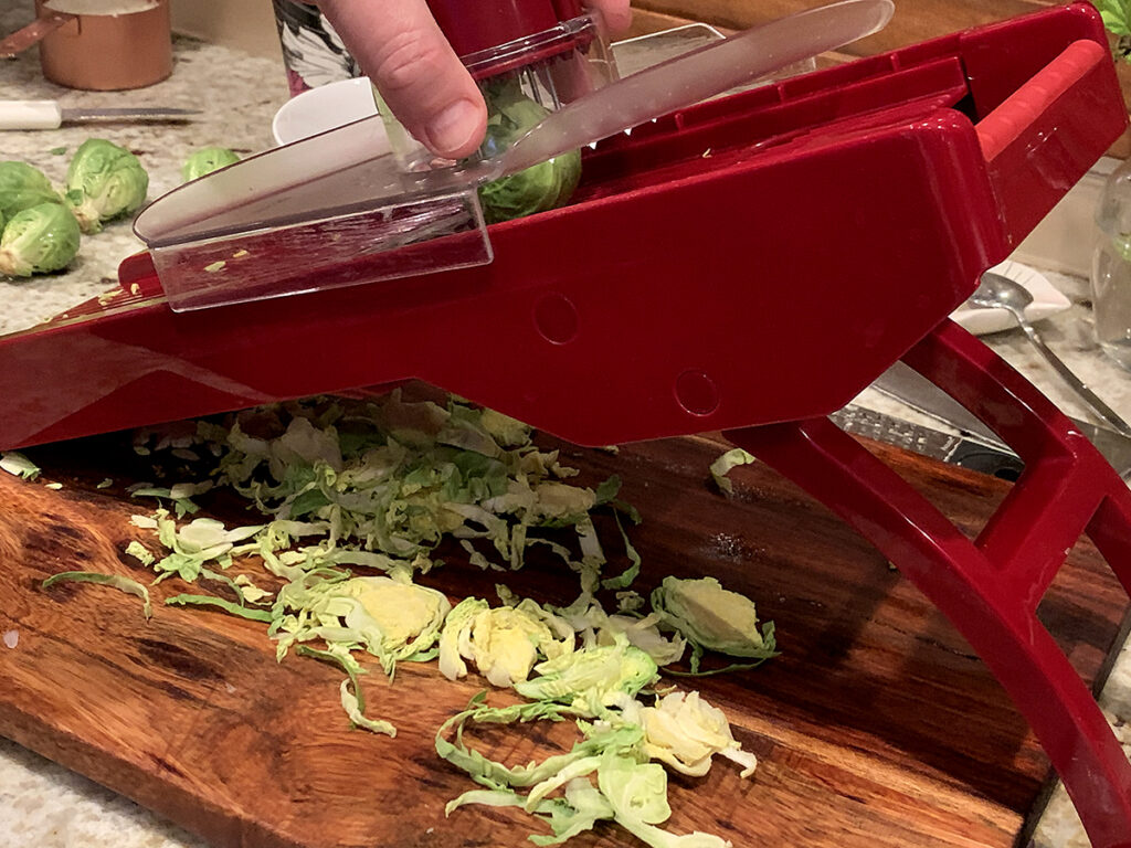 Wash and trim brussels sprouts, then slice or shred them. A mandolin set about 1/8” works best (see above image with safety tip), but you can use a food processor with the slicing blade or cut them with a knife one a time. Think of how you cut cabbage for slaw, you can also buy it pre-shredded.