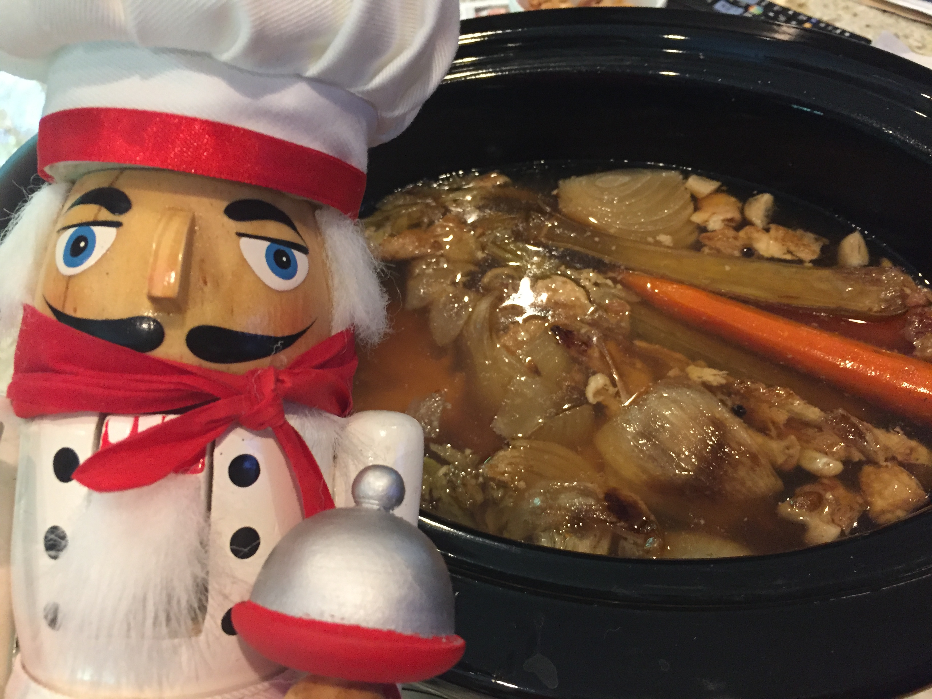 - Place chicken carcass in a Crockpot. Add all other ingredients.