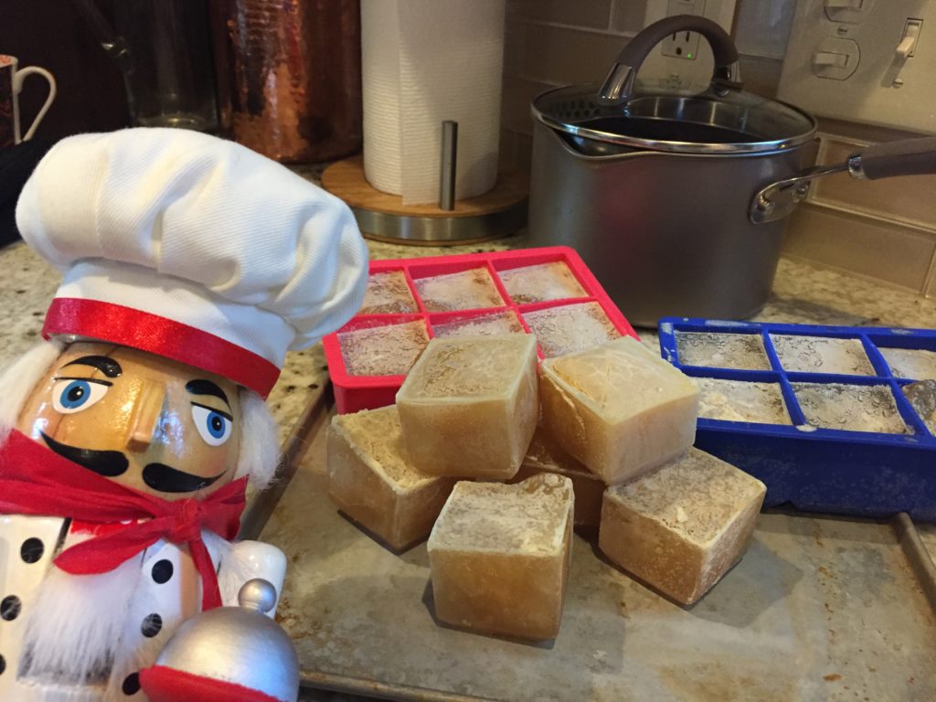 After they’re frozen I pop out the cubes and put them into a gallon size resealable bag and freeze. It’s really convenient to just pull out however many I need and toss then into a bowl in the microwave or pan on the stove.