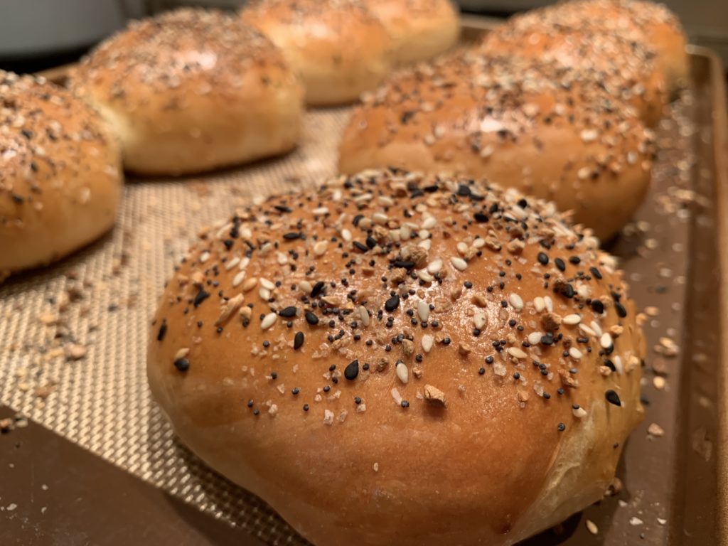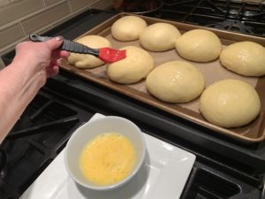 - Beat one egg into a small bowl, brush tops of buns with the egg and sprinkle with “Everything But the Bagel seasoning blend” or whatever you want, or nothing. Think outside the bun or at least on top of the bun.