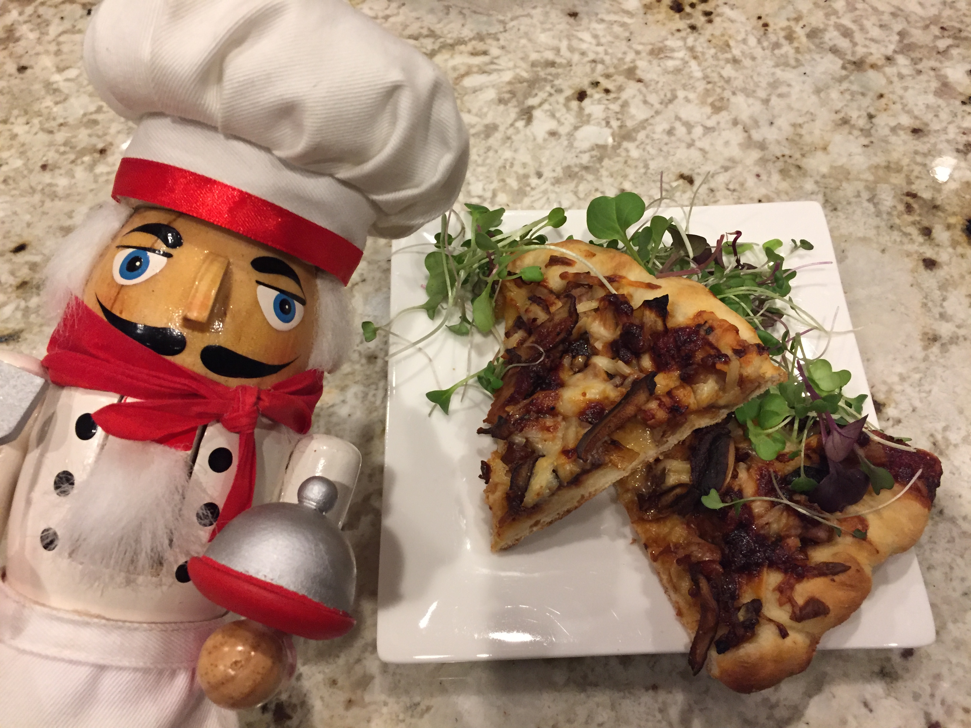 - Spread 1 TBSP olive oil on crust, then place half of the caramelized onions, half the duck, half of the mushrooms and half of the cheese on your pizza.