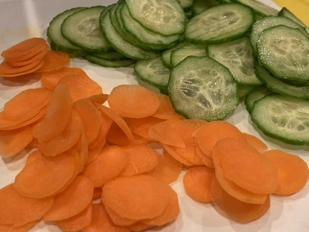 Slice cucumbers and carrots about 1/16” thin with a mandoline and arrange on top of cheese. Serve immediately. *see note below recipe if you don’t care to use a mandoline.