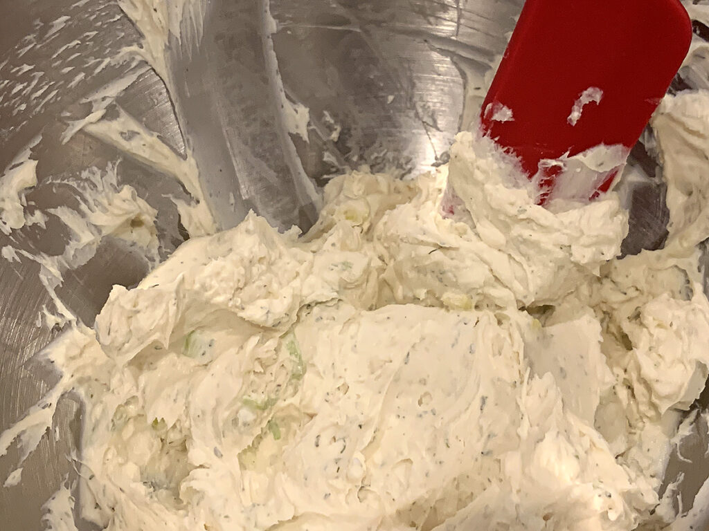 - Mix cream cheese, lemon juice, Worcestershire sauce, garlic powder, scallions, and dill weed together in a stand mixer.