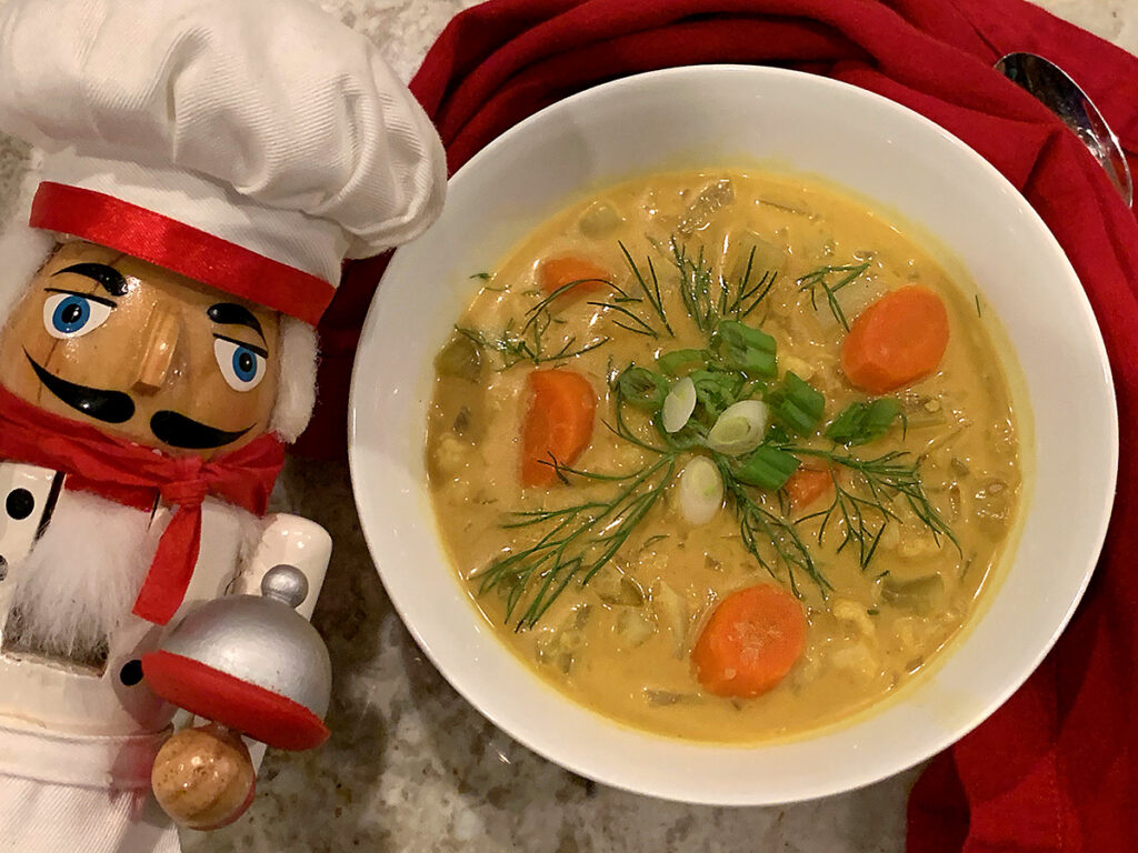 Stir in the garlic and cook for one more minute, then add the stock and two cups of water, hot paprika, white pepper and simmer for about 20 minutes or until leeks are very tender.