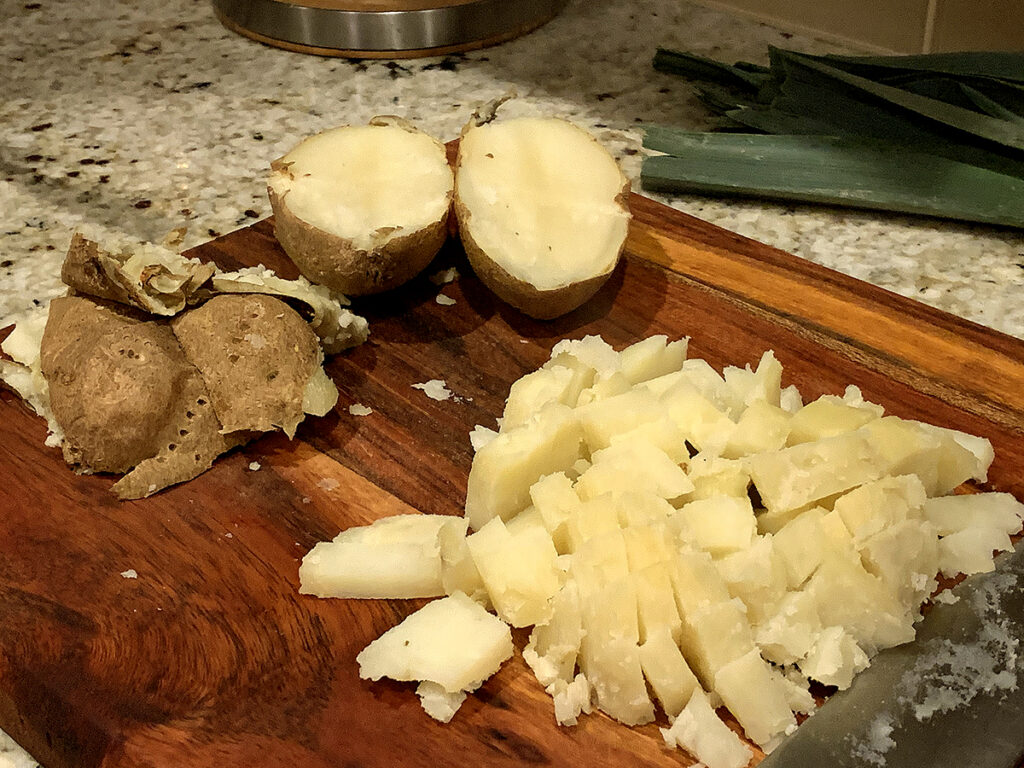 Cut one of the potatoes in half lengthwise and scoop out the inside with a large spoon, then cut the potato in 1/2”/1.27cm cubes and set aside (this will go in as chunks at the end).