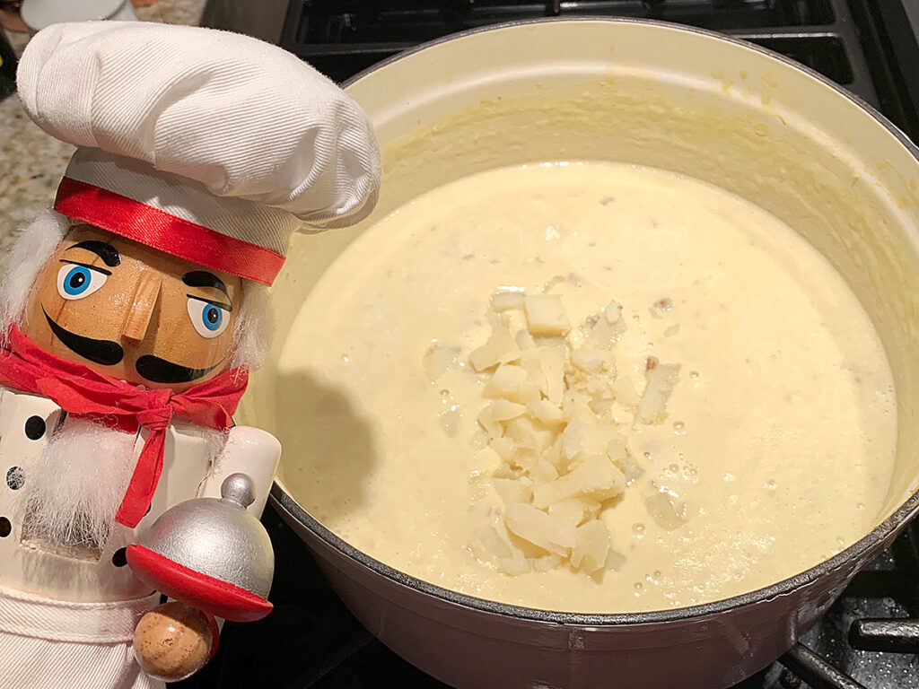 - Melt butter in a dutch oven or soup pot on medium, add the leeks and a large pinch of salt. Cook this, stirring occasionally for about 10 minutes or until leeks have softened. Stir in the garlic and cook for one more minute. Add the stock and two cups of water, hot paprika, white pepper and simmer for about 20 minutes or until the leeks are very tender. Cut one of the potatoes in half lengthwise and scoop out the inside with a large spoon. Cut the potato in 1/2”/1.27cm cubes and set aside (this will go in as chunks at the end). Chop the entire remaining potato and the skin from the first potato, and add to the pot.