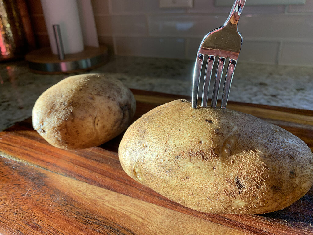 Preheat oven to 375°F/190°C/Gas Mark 5. Wash potatoes and pierce several times with a fork or sharp knife. Place directly on oven rack and bake for 45 minutes or until fork pierces easily all the way to the center. Let cool enough to handle.