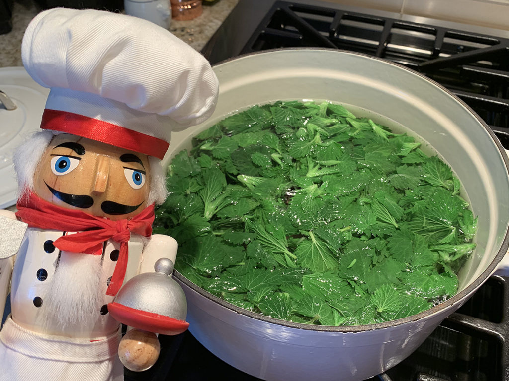 Clean and trim stinging nettle leaves. I like to use a salad spinner so I can dump the leaves right into a pot of boiling water. Use a non-reactive pan* or your leaves will turn black. (see note), Get a pot of water boiling and blanch leaves for 1-2 minutes. They are now safe to handle without being stung.