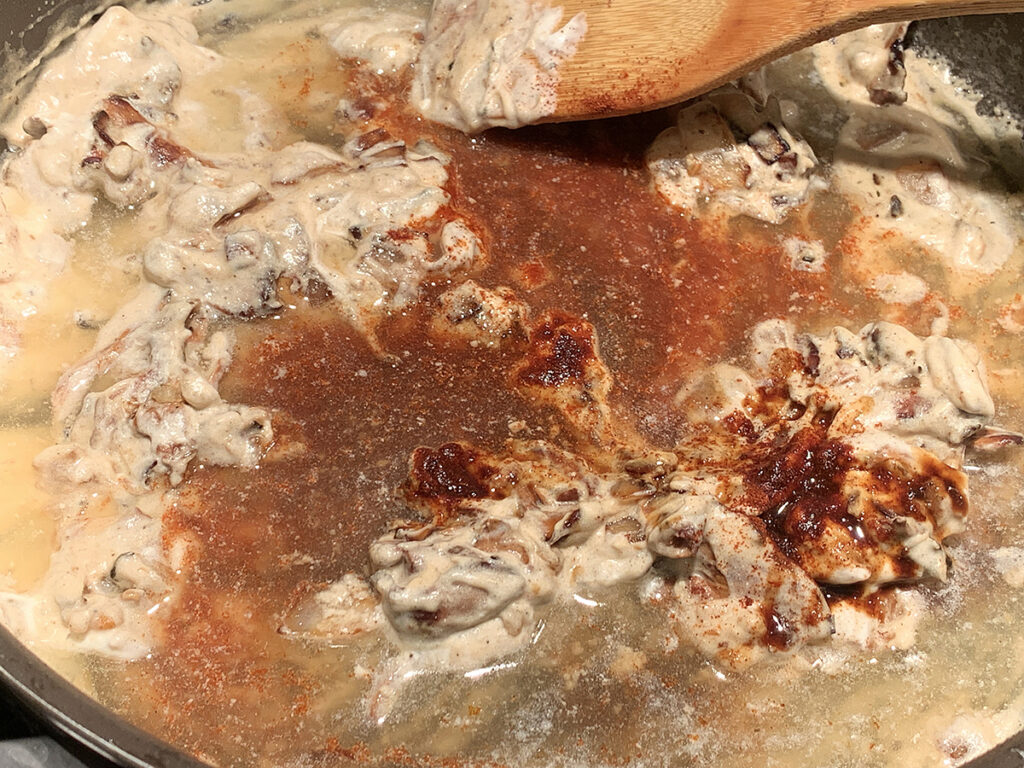 - Pour the wine and stock into the sauce, and add worchestershire sauce, paprika, and black pepper. Let this simmer for a bit to thicken up, taste and adjust seasoning if needed.