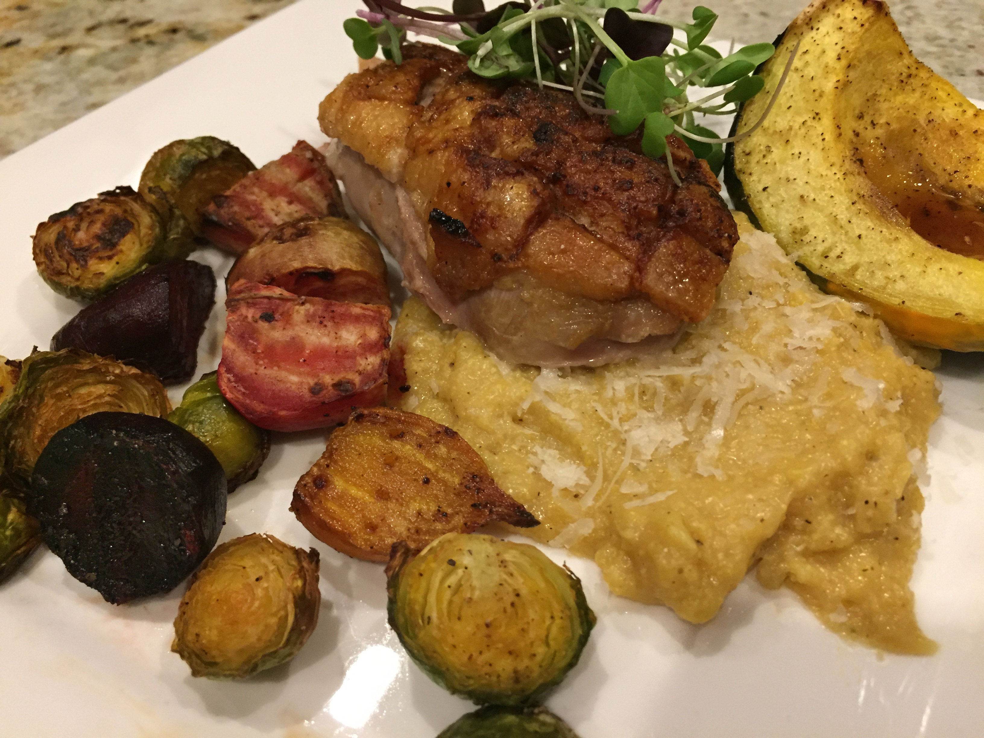 I seasoned these veggies with olive oil, salt and pepper and roasted them during the last 15 minutes in the same oven as the duck and continued roasting them for 10 to 15 minutes more while the duck was resting. I added just a bit of brown sugar to the acorn squash.
